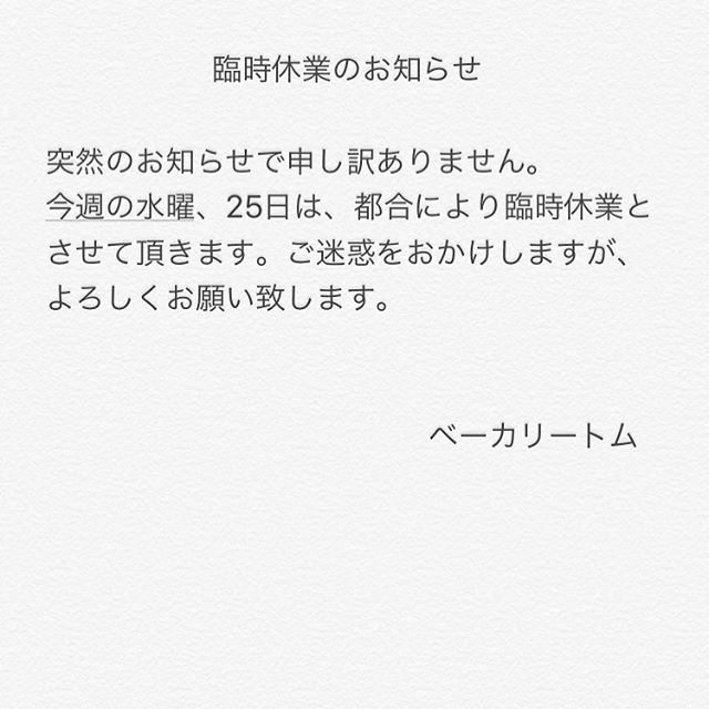 # ベーカリートムです。大変ご迷惑をおかけしますが、25日は臨時休業となります。よろしくお願い致します。